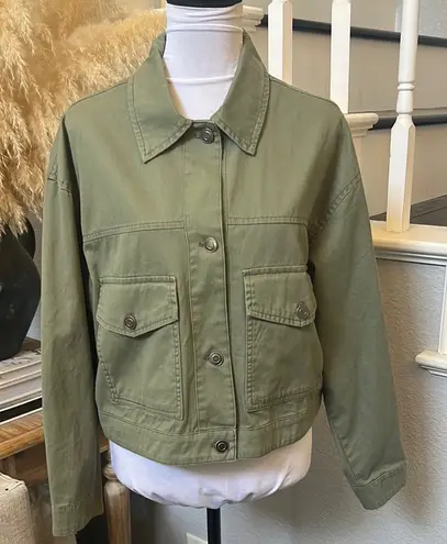 cropped, light green military-style jacket, likely made of cotton, with a button-up front and two front pockets Elastic waist in back of jacket. olive green, army green, and khaki. This style of jacket is a good option for transitioning between seasons and can be paired with jeans, t-shirts, and bootie Pit to Pit 22” Length 21”