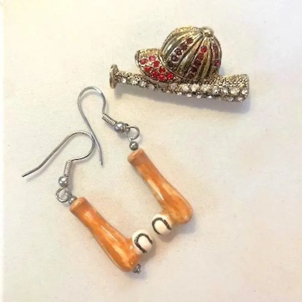 Perfect for the baseball or softball mom! This listing includes both the baseball pin/brooch shown and the baseball bat drop earrings. 1. The vintage brooch/pin has a baseball hat/cap and baseball bat adorned with red and white stones on a gold toned metallic setting. This is a vintage pin, but not sure of age. 2. The drop earrings feature a brown bat with baseball attached at the bottom. EUC - only worn a few times - sat in my jewelry box for years - and now my kids are all grown up! Zoom pics to see condition. Please ask any questions. Thanks for looking and happy shopping! ACC011
