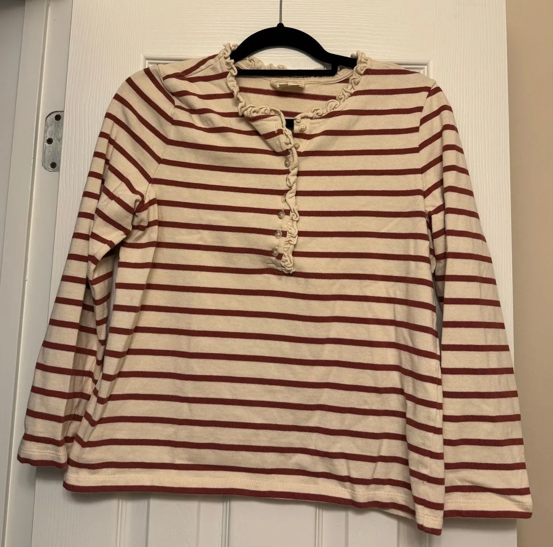 Super cute, 100% Cotton Sezane Stripe Top with lettuce trim and half button up front, red and cream... Show more