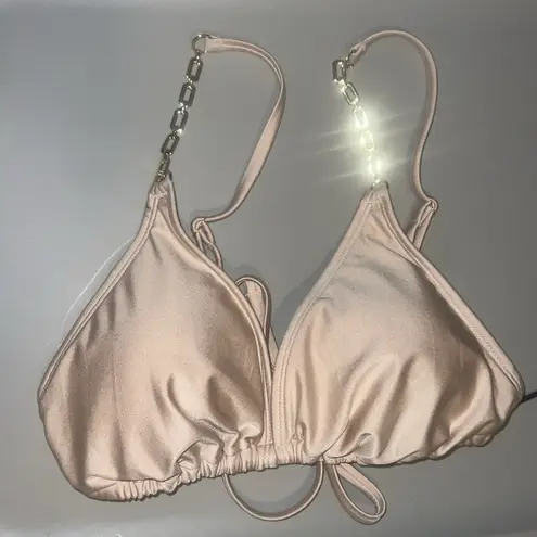 Elegant soft shimmer beige bikini top with stylish chain straps. Perfect for a chic beach look. Ele... Show more