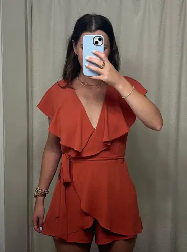 Rust colored romper with a wrap tie, v-neck, and ruffled top! No snap closure!