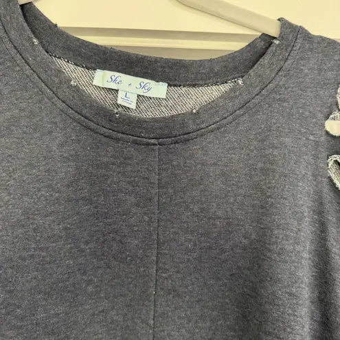 The She + Sky Distressed Knit Sweater in Blue, size Large, is a stylish and comfortable addition to... Show more