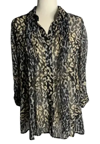 Sheer Leopard Print Button Up Blouse S Black Pin Tuck Pleats 3/4 Sleeves Collar - $18 - From Crystal