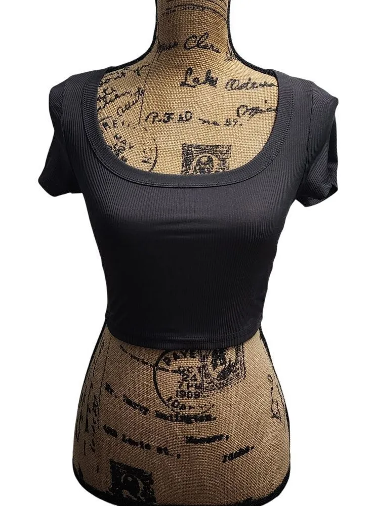 SHEIN Black Ribbed Scoop Neck Crop Top Basic Short‎ Sleeve Fitted Tee Size S/4 - $9 - From Lynn