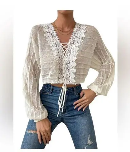 SHEIN Very Cute Romantic Boho Festival Casual Lace Up Blouse Cream Off White Colored Lace Up F... Show more