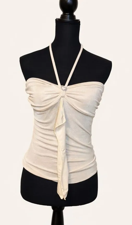 SHEIN cream halter top with ruched front and sparkly heart detail, size Large, soft stretchy fabric,... Show more
