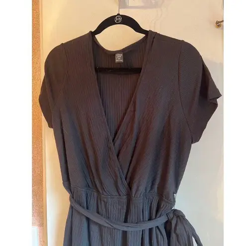 This romper offers both style and comfort with its ribbed fabric and wrap design. The tie waist acce... Show more