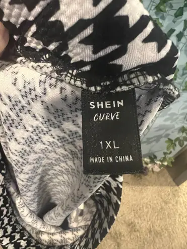 SHEIN curve 1x printed black & white houndstooth midi skirt with flare out at the bottom.