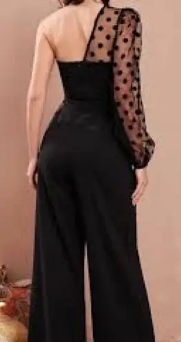 Item: This elegant black one-shoulder pantsuit features a stylish polka dot mesh sleeve, perfect for... Show more