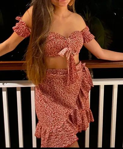 In excellent condition, red & white set. Features a wrap and tie skirt and some ruffle details on th... Show more
