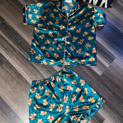 Stylish teal pajama set with floral pattern. Comfortable and chic for lounging. Teddy bear pajama... Show more