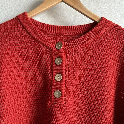 Nice deep orange color sweater. Some signs of wear. Fabric is 50/50 cotton polyester