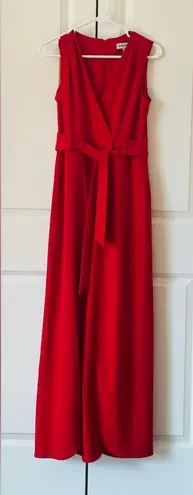 Elegant red sleeveless jumpsuit by Shelby & Palmer, perfect for bridal events, graduations or any special occasion. Soft woven fabric with beautiful flow and front leg slits that show just the right amount of leg when you walk. • Brand: Shelby & Palmer • Size: 6 • Color: Red • Style: Sleeveless wrap-look jumpsuit • Wide legs with front slits (open in the front on both legs) • Self tie belt at waist with belt loops • V-neckline, zip closure at back • Great for rehearsal dinners, bridal showers, parties or dressy evenings Stylish, flattering and super easy to dress up with heels and a clutch. Preowned with excellent condition.
