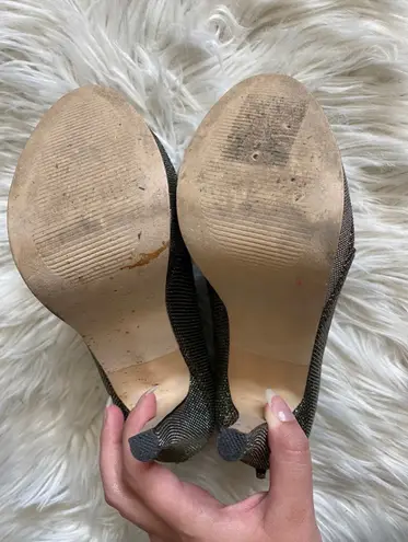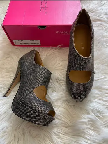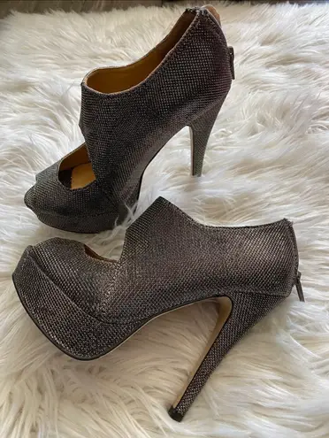 Sparkly silver/gray cutout platform peep toe heels. Stiletto heel, chunky platform. Zippered back cl... Show more