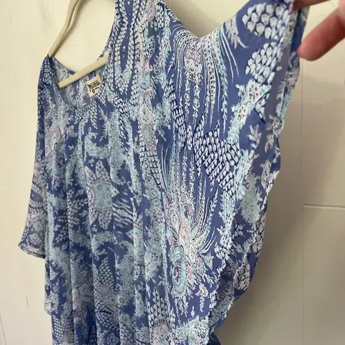 Embrace your inner bohemian with this stunning Mumu tunic blouse. The sheer blue chiffon fabric flow... Show more