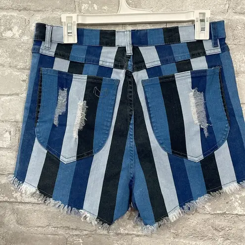 Stylish blue striped denim shorts perfect for a casual day out. Features a trendy distressed look. W... Show more