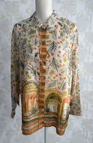 This lightweight Sigrid Olsen blouse offers a tropical flair with its vibrant design. Made from 100% silk, it's perfect for warm weather. The button-down style and loose fit make it a versatile addition to any wardrobe. • 100% silk material • Tropical design • Button-down style • Lightweight and breathable • Perfect for warm weather Condition: Pre-Owned Good Features: • Blouse Size: Womens 1X