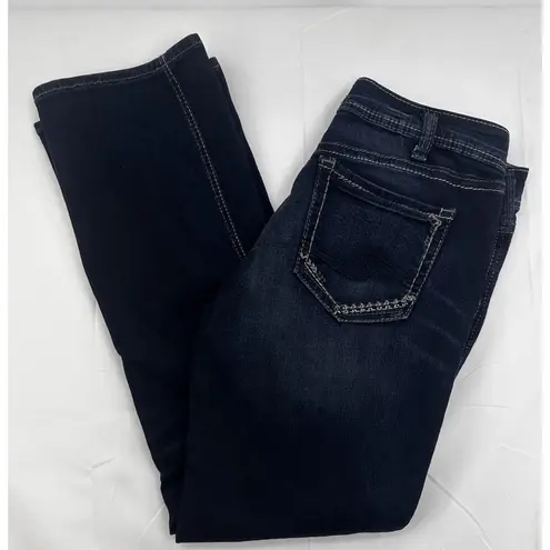 The SILVER Suki Slim Boot jeans for women in long, dark blue stretch denim are perfect for a Western-inspired look. These low-rise jeans feature a 5-pocket design with embroidered logo accents and a slim fit. Made from a comfortable polyester, spandex, and cotton blend, these jeans are both stylish and practical for any season. With a mid-rise and a 33-inch inseam, these jeans are a versatile addition to any wardrobe, showcasing the brand's signature Western theme. Perfect for a casual yet chic style, these jeans are a must-have for any fashion-forward woman.
