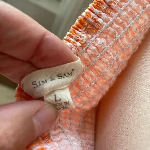 Sim & Sam from Nordstrom, Orange and white micro check or gingham bare midriff dress. Pouf short sleeves trimmed with elastic for a little extra oomph, crosses across the chest and heavily smocked across the back before opening to a bare midriff that is surrounded by an elastic for a flexible fit. The skirt is full with a large ruffle at the bottom and mid length. The skirt is whined. Lane flat measure 17.5 inches armpit to armpit stretching to 21 inches without much resistance. The waist measures 12 inches straight across stretching to 16 inches without much resistance. Approximately 44 inches shoulder to hem. pairs equally as well with sandals or heels for a date night or cowboy boots for a festival or concert