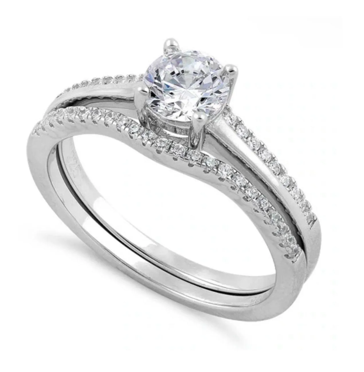 * Top of ring height: 6.3mm * Band width: 3.4mm * Shank width: 3mm * Stone material: clear cubic zirconia * Center stone size: 5.7mm * Stone shape: round * Center stone carat weight: 0.76 ct. * Total number of CZ stones: 42 * Stone setting: basket prong setting * Metal: 925 sterling silver * Plating: rhodium plated * Finish: high polish Will come packaged and ready to be gifted and loved!