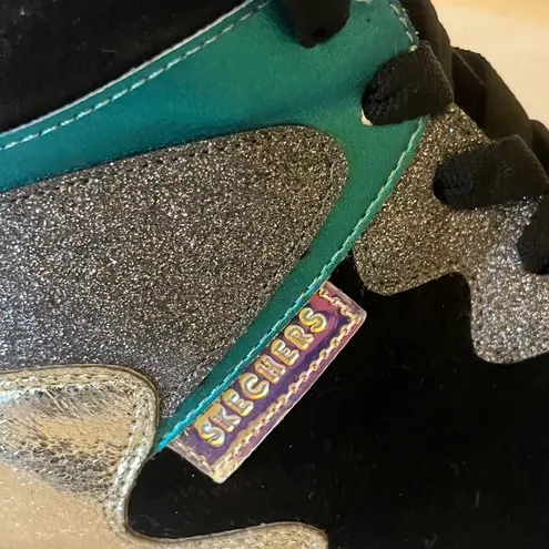 Skecher with gold, silver glitter, pink, turquoise, black suede and cheetah print around toe box wit... Show more