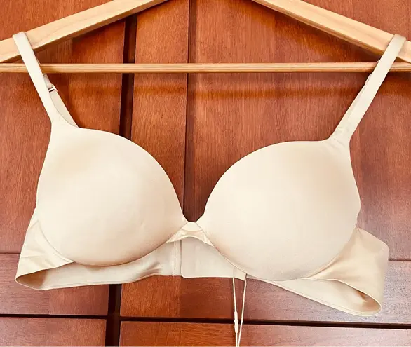 Light tan bra from Skims. Features underwires, push-up padded cups, soft fabric, adjustable straps, and a back hook and eye closure. Condition: this bra is new with tags, but has some ripples in the cups from storage. Size 34A Nylon, spandex, polyester