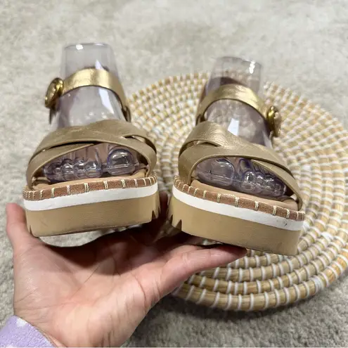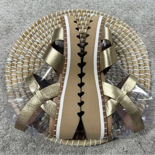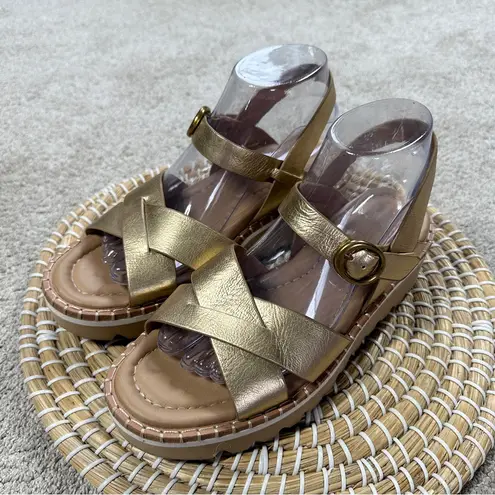 Note: • Preowned Condition. • There are some signs of wear and/or general use (showing in picture). • Please see pictures for details. • Color may vary slightly due to lighting conditions. Walk, relax or play all day in these fresh and fun sandals with a sporty sole. A go-anywhere sandal with a mid-height platform and grippy lug sole, the Ruthie is detailed with artisanal stitching for maximum summer vibes. Offered in Italian leather or metallic leather Adjustable buckle Leather lining and synthetic footbed lining Cushioned footbed with padding at heel for extra comfort Rubber-EVA blend outsole with blanket stitched leather welt Heel Height: 2 1/4 inches