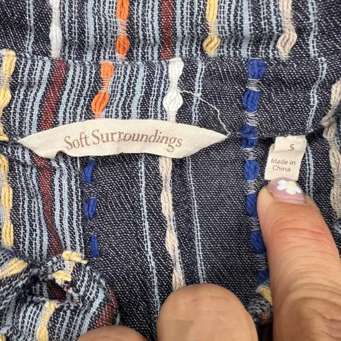 Excellent preowned condition No flaws Boho denim casual Split cuff sleeves Multicolor and textured stripes give a hand woven look Button up both front and back Full measurements in photos