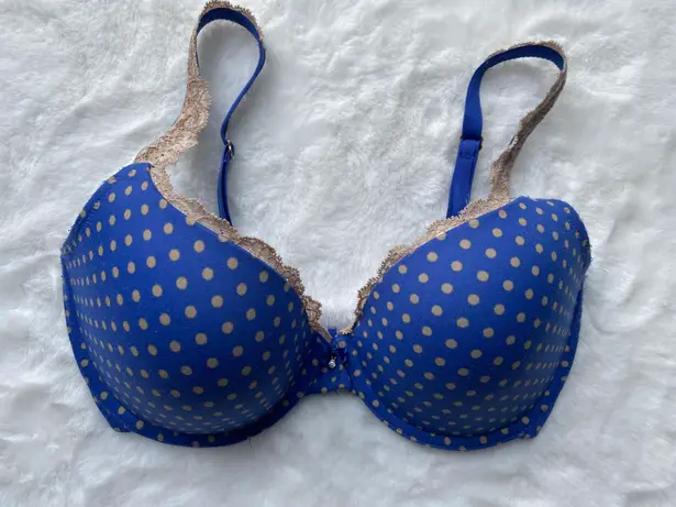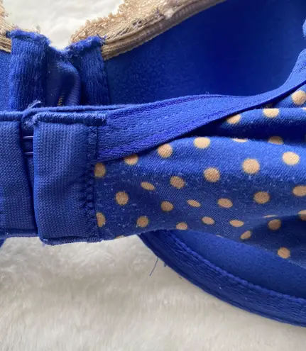 Previously loved Soma Intimates Embraceable Full Coverage with Lace Trim Bra. - Size: 32DD - Color: Royal Blue with Tan polka dots - Style: Embraceable Full Coverage Lace Trim - Measurements while laying flat without stretching are approximately: -- Straps: - Flaws noted: It has minor pilling in the fabric (see pictures).