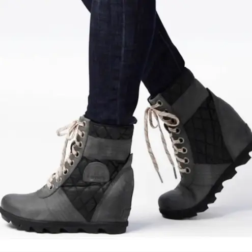 Sorel Lexi Wedge Boot Olive Green and Black Quilted Leather Ankle Boots Lace up Contrast Off Whi... Show more