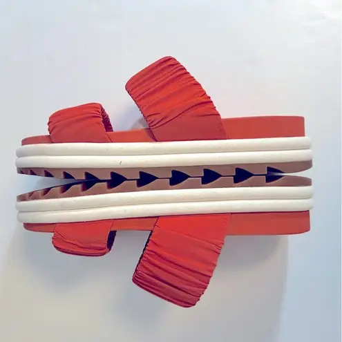 Sorel Sandals Roaming Desert Sun Two Strap Slides. Color- desert sun, chalk Ruched textile upper S... Show more