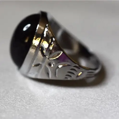Intriguing Aztec Design Silver Tone Band Black Smooth Oval Stone Sz 11 & 13 Ring - $10 - From Chrystal