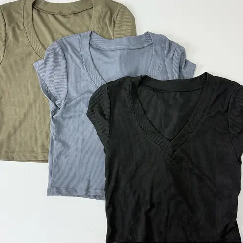 Chic V-neck ribbed tops. Perfect for casual wear. Listing is for bundle of 3 tops: Black, Olive Green and Blue-toned Grey. Deep V. May run 1-2 sizes small depending on the look you are going for, but ample stretch. These make for a great vacation or casual option and can work well for gymwear or athleisure New without tags. 100% Polyester Unbranded Chest - apx 13.5" Waist - apx 12" Length - apx 15.5"