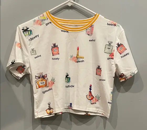 Women’s white cropped Tee - White and Yellow with perfume pattern Size M - $13 - From Lisa