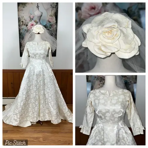 Gorgeous ivory brocade wedding gown Features elegant floral design and delicate pearl details. Includes a perfectly matching veil! Gown was preserved but I noted a stain on the back of the arm near the cuff. I did not try to launder. This doesn’t affect the value of this gown, in my opinion. It’s perfectly intact and absolutely stunning! Bust measures 31”, waist is 25”, length is 60”