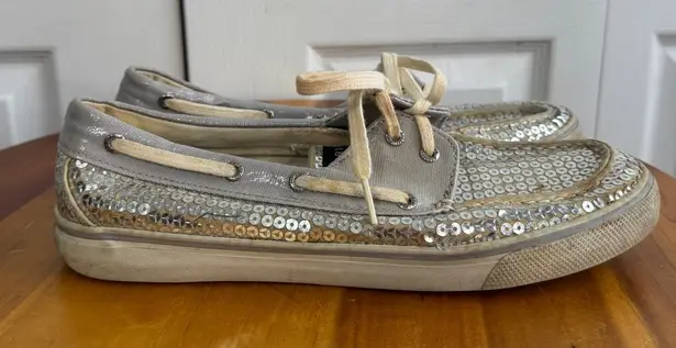 Good condition - stained, top sided Bahama silver sequins slip on boat shoes size 9