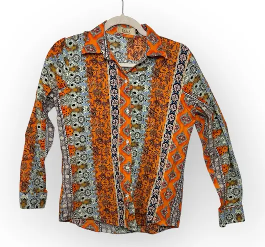 A vibrant button-front shirt featuring an eclectic patchwork floral print in orange, navy, and gold tones. This lightweight top blends indie folk, boho, and eclectic artwear aesthetics with its mixed motifs, contrast patterns, and feminine tailored silhouette. • Condition: Excellent • Material: 100% Cotton • Measurements: – Pit to Pit: 18.5” – Length: 24” Ships from a smoke-free and pet-friendly home.
