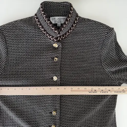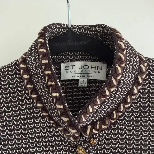 Condition: Excellent condition, no flaws Clean and well kept throughout. Includes: 2-piece knit set — jacket and pencil skirt Tag size: 6 of the jacket Size 4 of the skirt Color: Brown and cream white woven texutred with gold-tone St. John buttons down the front and band collar. Pencil silhouette with elastic waist in matching knit for comfort and ease