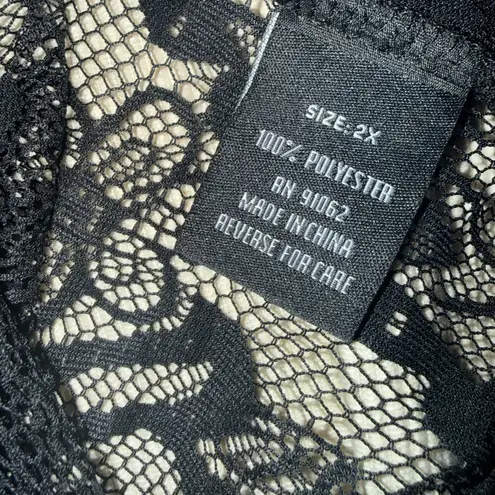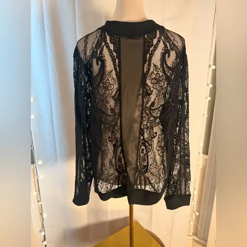 Elegant black lace bomber jacket by Standards & Practices. Features an allover floral lace design with a zip-front closure, ribbed collar, cuffs, and hem for a modern bomber silhouette. Lightweight and semi-sheer — perfect for layering over tanks, dresses, or camis. ✨ Details • Brand: Standards & Practices • Size: 2X • Color: Black • Style: Lace bomber / zip-front jacket • Fabric: 100% polyester • Ribbed neckline, cuffs & hem • Unlined / sheer lace • Full front zipper 📏 Approx. Measurements (laid flat) • Pit to pit: ~25–26” • Length: ~24–25” (Measured flat; lace has minimal stretch. Please compare to your favorite jacket.) 🧼 Care Reverse for care. Machine wash cold recommended. 📌 Condition Very good pre-owned condition. No holes or stains noted. Zipper functions properly. AB4
