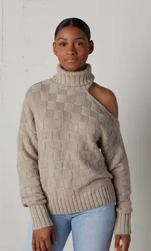 STAUD Rockey Turtleneck Sweater Checkered Shoulder Cutout Frappe Tan Size Small - $50 - From STL