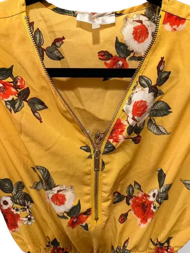 Small boho chic tunic dress floral spring winery dress Stella Tweed amber yellow mid-zip floral knee length dress with button roll-up sleeve size small Size small Approx: 27” bust circumference and 30” length from shoulder to bottom hem You will need to use a slip underneath as it is slight see-through Mid-way zip for enclosure and tie waist front 100% polyster Pair with a light brown cowboy boots! #cowboydress #floralyellow #spring #whimsicle