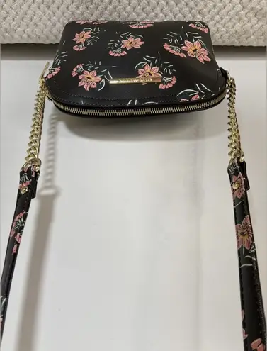 Adjustable crossbody strap Flap over with button closure Interior zip Silver tone hardware Interior... Show more