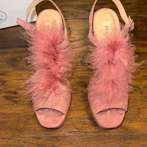 Elegant blush heels with feather accents. Perfect for special occasions. Worn once, still in great c... Show more