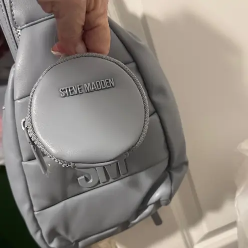 Sleek gray backpack with compact design. Features a small detachable pouch. Ideal for everyday use.