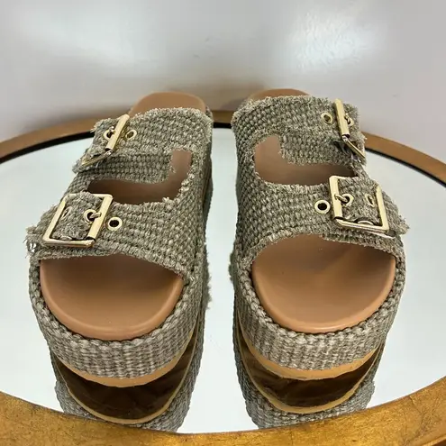 DETAILS – Flatform slide sandal – Slip-on style – Molded footbed – 2 buckled woven slide straps – Wo... Show more