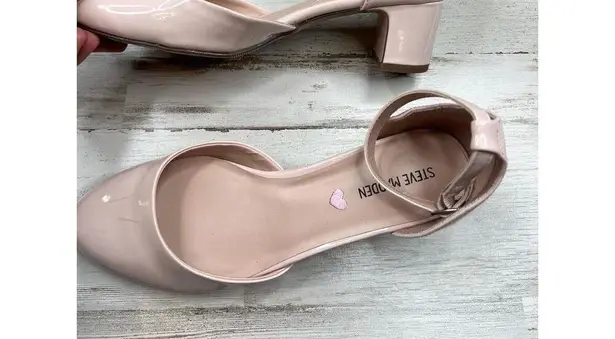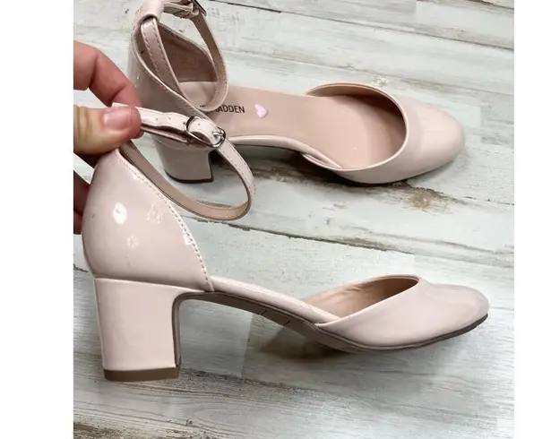Step into style with these Steve Madden block heel heels. The nude patent leather gives a chic and versatile touch, while the ankle strap and round toe design keeps them comfortable all day. A perfect pick for elevating any outfit.