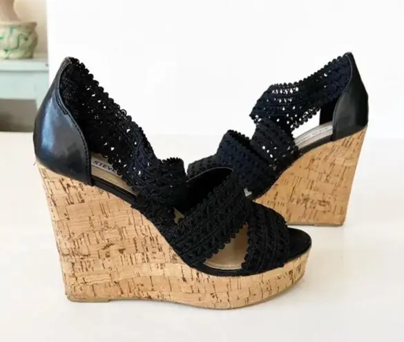 Steve Madden Elston cork wedge in black faux leather size 7. 4.5” wedge heel. These are some serou... Show more