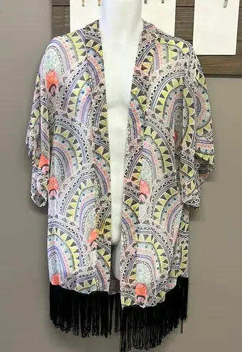 Gently used great condition Steven Madden Sheer Geometric Tassel Open Kimono Coverup with Neon Colo... Show more