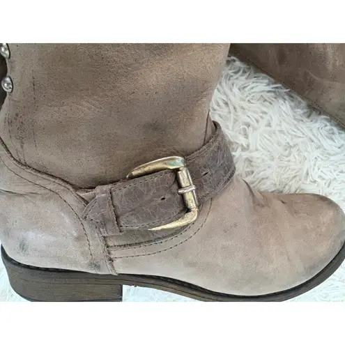 Bohemian spirit comes alive in these knee-high boots. The boots showcase a distressed beige hue, per... Show more