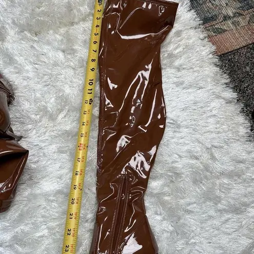Steve Madden Viktory Cognac Patent faux leather sock Over The Knee 4” Stiletto Heel Boots Size 8M Ex... Show more